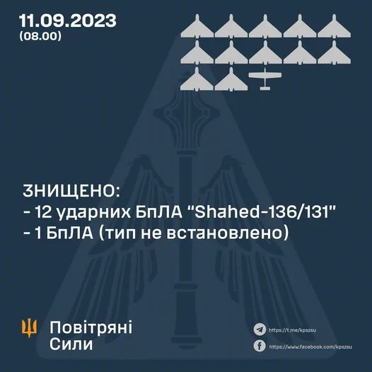 Según el Ministerio de defensa de Ucrania, la pasada noche derribaron 13 drones-kamikaze Shahed, no se indica cuantos les lanzaron