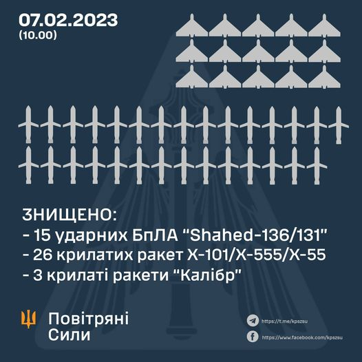 Según el Ministerio de defensa de Ucrania, la pasada noche derribó todo lo que le lanzaron los rusos, a saber: