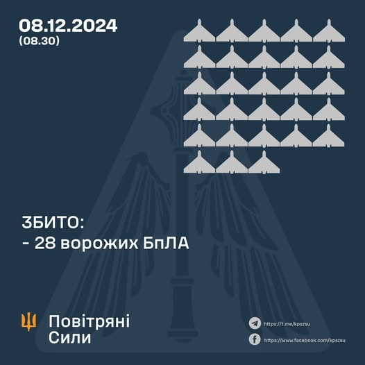 У ніч на 28 грудня (з 18.00 27 грудня) противник атакував 48-ма ударними БпЛА типу Shahed, Гербера і безпілотниками інших типів із напрямків: Орел, Курськ, Приморсько-Ахтарськ – рф., Гвардійське, Чауда - ТОТ АР Криму, близько 30 із них – "шахеди".