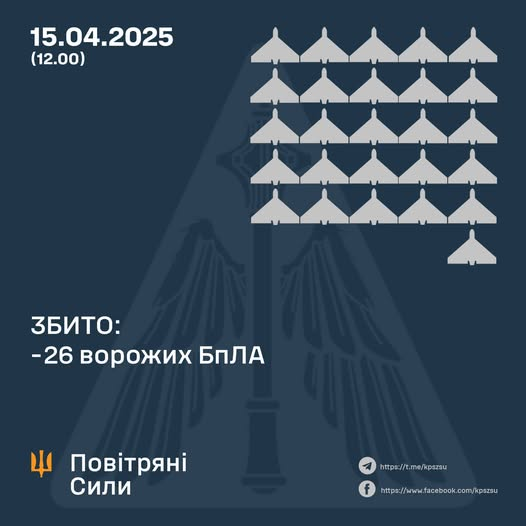 У ніч на 26 грудня (з 18:00 25 грудня) противник атакував однією балістичною ракетою Іскандер-М із ТОТ АР Крим, а також 99 ударними БпЛА типу Shahed, Гербера і безпілотниками інших типів із напрямків: Брянськ, Курськ, Приморсько-Ахтарськ – рф, Гвардійське - ТОТ АР Криму, близько 60 із них – "шахеди".