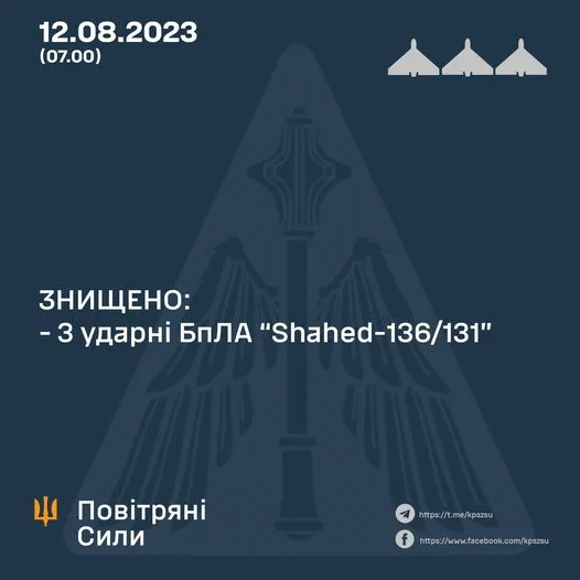 у взаємодії із протиповітряною обороною інших складових Сил оборони України, знищено 12 “Shahed-136/131” у межах Запорізької, Дніпропетровської та Миколаївської областей, а також один БпЛА невстановленого типу.