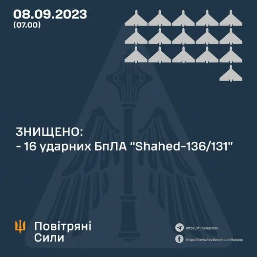 Зафіксовано влучання 16 ударних БпЛА на 11 локаціях, а також падіння збитих (уламки) на двох локаціях.