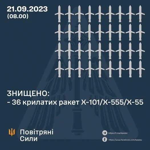 Según el Ministerio de defensa de Ucrania, la pasada noche derribaron 36 de los 43 misiles J-101/J-555/J-55 que les lanzaron los rusos