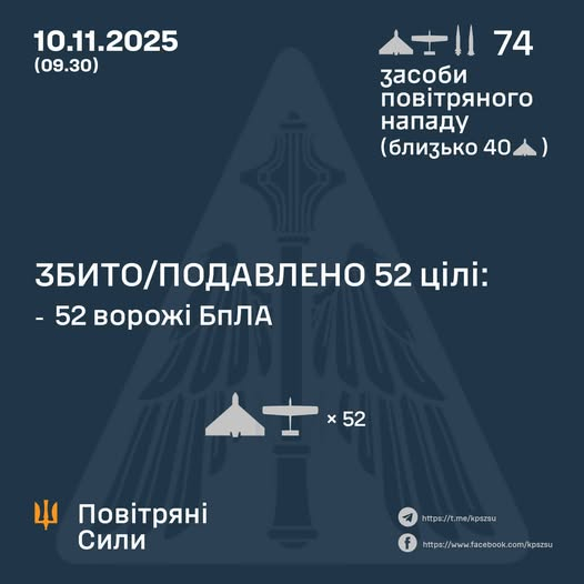 💥 За попередніми даними, станом на 08:30, протиповітряною обороною збито/подавлено 53 ворожі БпЛА.